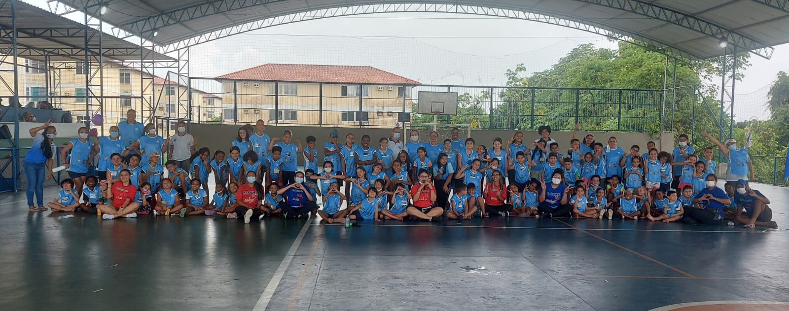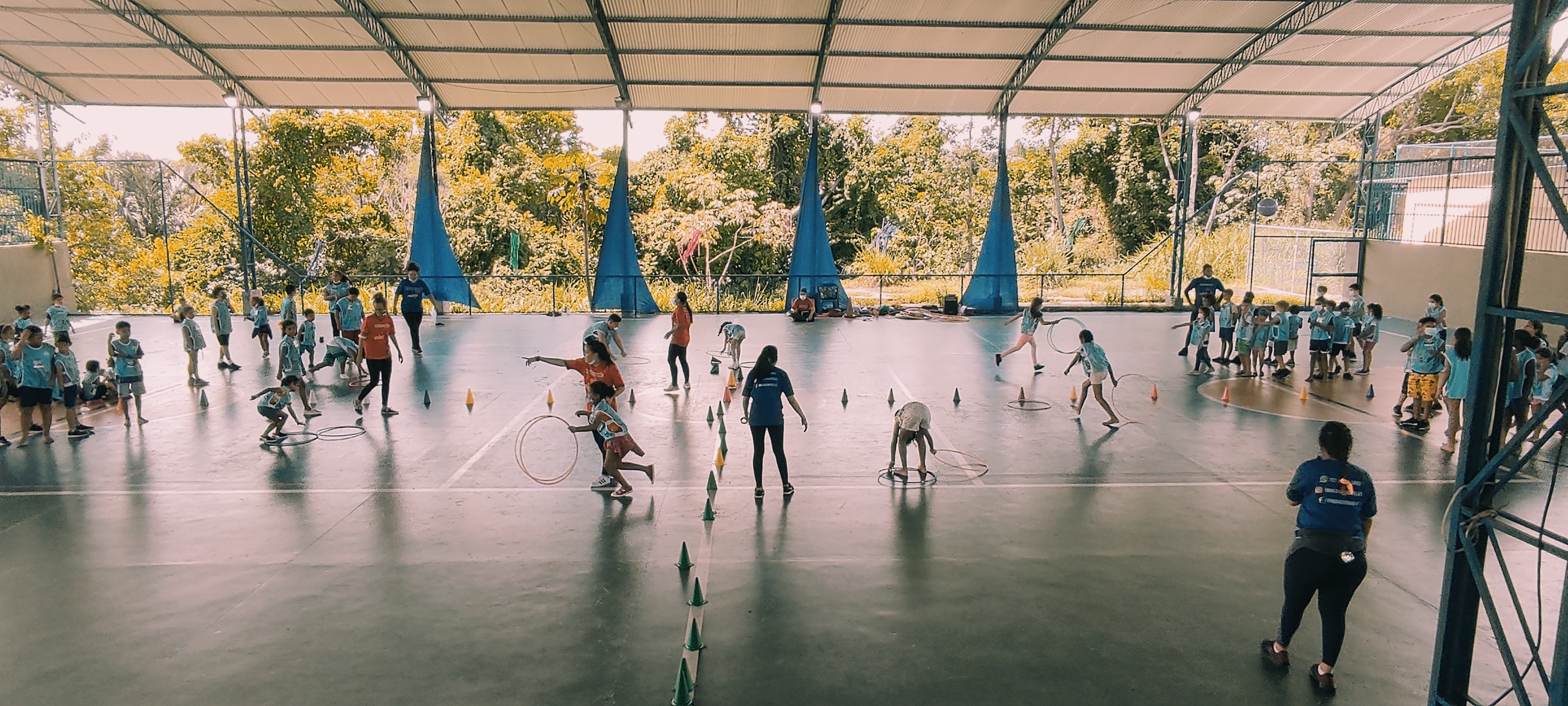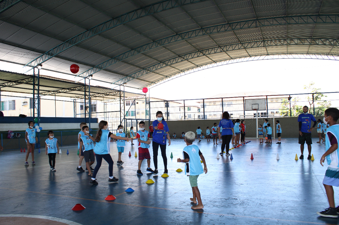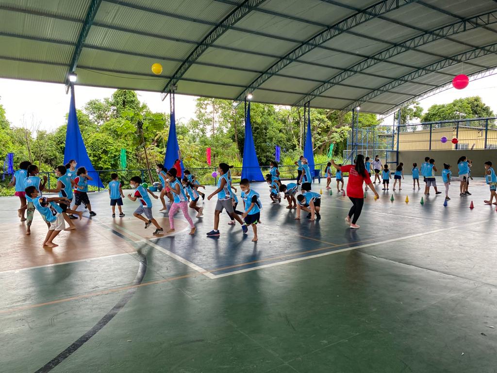 Além das atividades físicas em grupo, as crianças foram distribuídas em equipes: “Pantera Negra”, “Pantera Roxa”, “Leopardo” e “Jumanji.