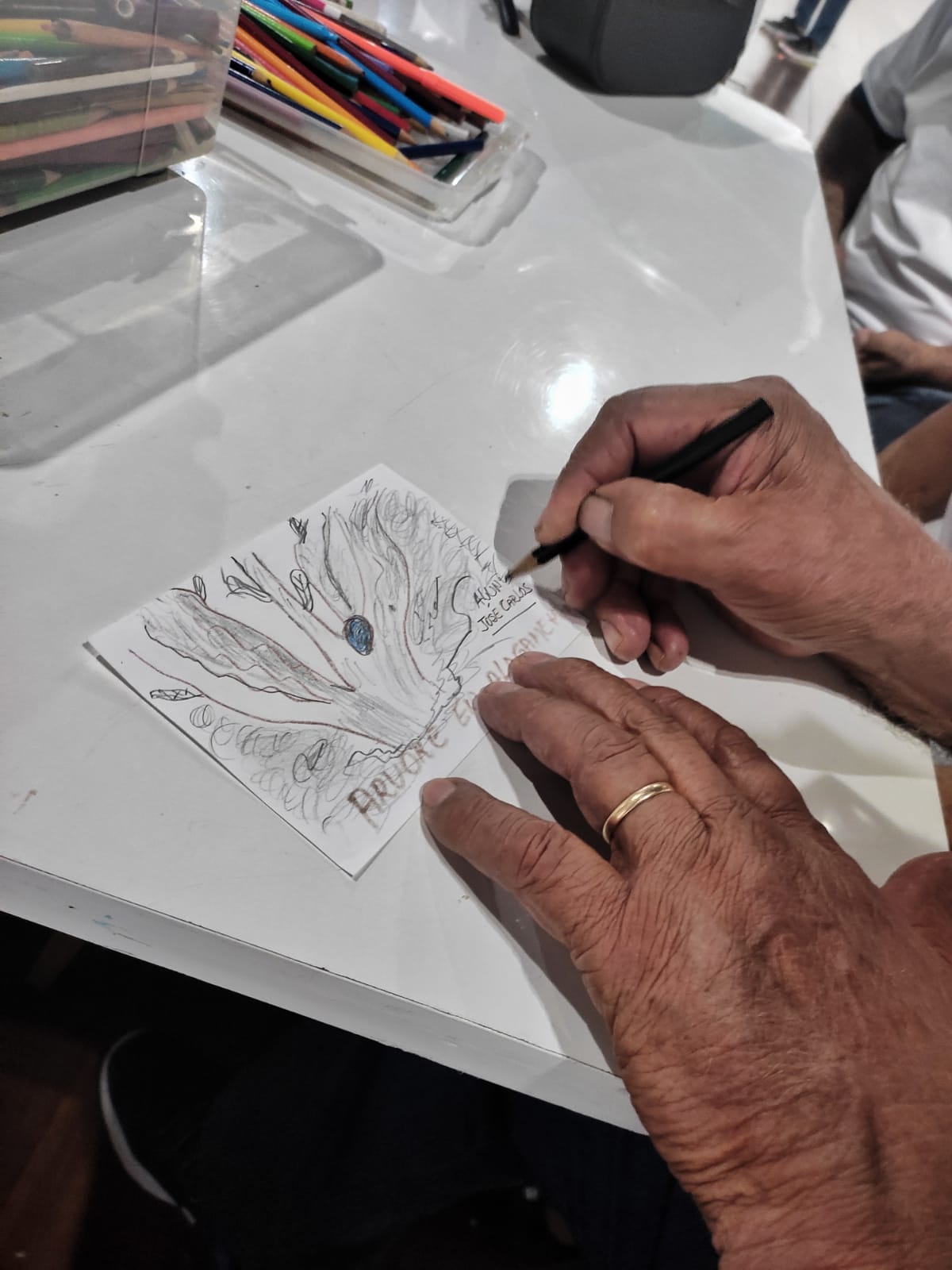 Para deixar a visita ainda mais interessante, os instrutores do MABEU prepararam uma atividade surpresa, onde os idosos tiveram a oportunidade de colocar em prática o que estão aprendendo durante a Oficina de pintura e desenho.