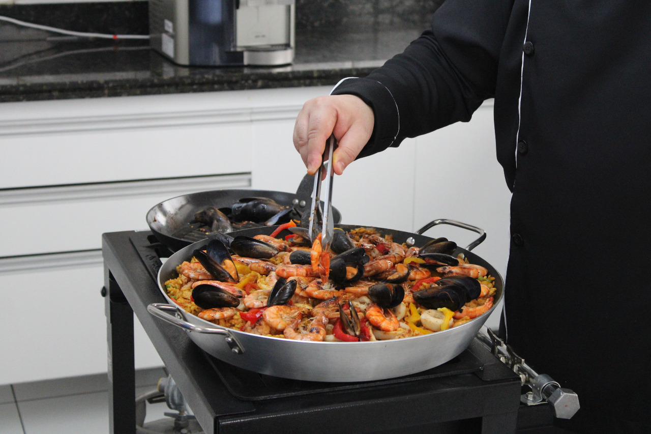 Durante a oficina, foi ensinada aos participantes uma receita de paella, característica da gastronomia da Espanha.