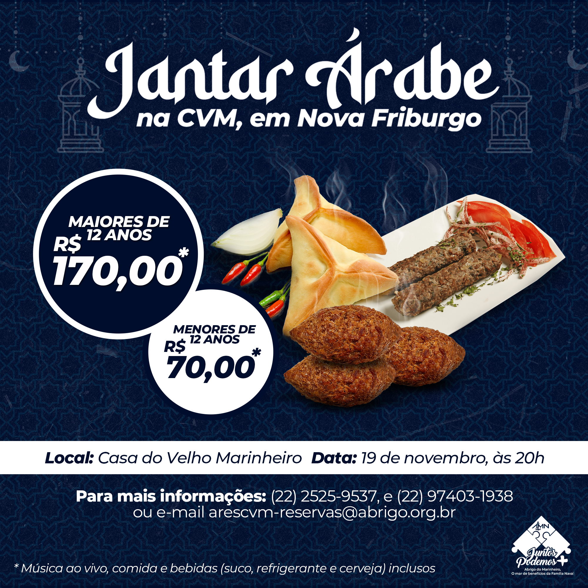 O Abrigo do Marinheiro em Nova Friburgo convida a Família Naval para um “Jantar Árabe”, que ocorrerá no dia 19 de novembro de 2022, às 20h.