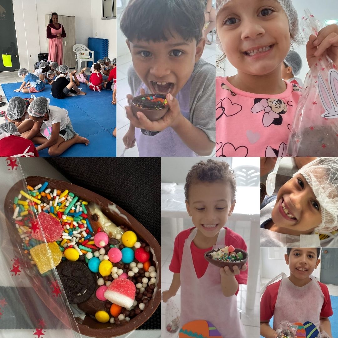 A atividade do IntegrAção, realizada em dois turnos, contou com uma linda história que trouxe temas como empatia, generosidade e amizade, e na sequência os nossos pequenos puderam produzir seus próprios Ovos, desde a casca de chocolate até o recheio!