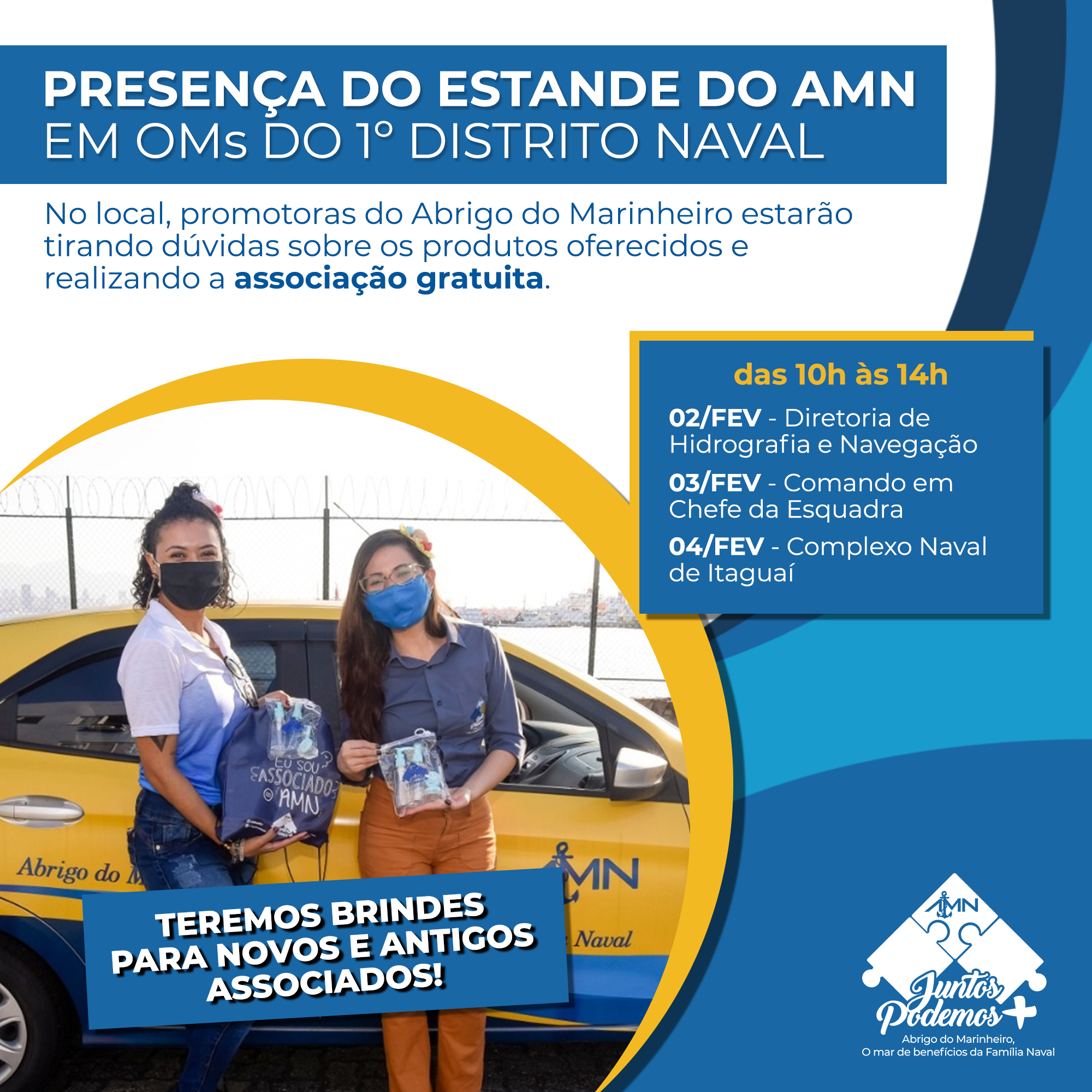 Com objetivo de ampliar a divulgação dos benefícios para a Família Naval, estaremos presentes na Diretoria de Hidrografia e Navegação hoje, dia 2, no Comando em Chefe da Esquadra amanhã, dia 3, e no Complexo Naval de Itaguaí no dia 4, sempre na proximidade do rancho, entre 10h e 14h.