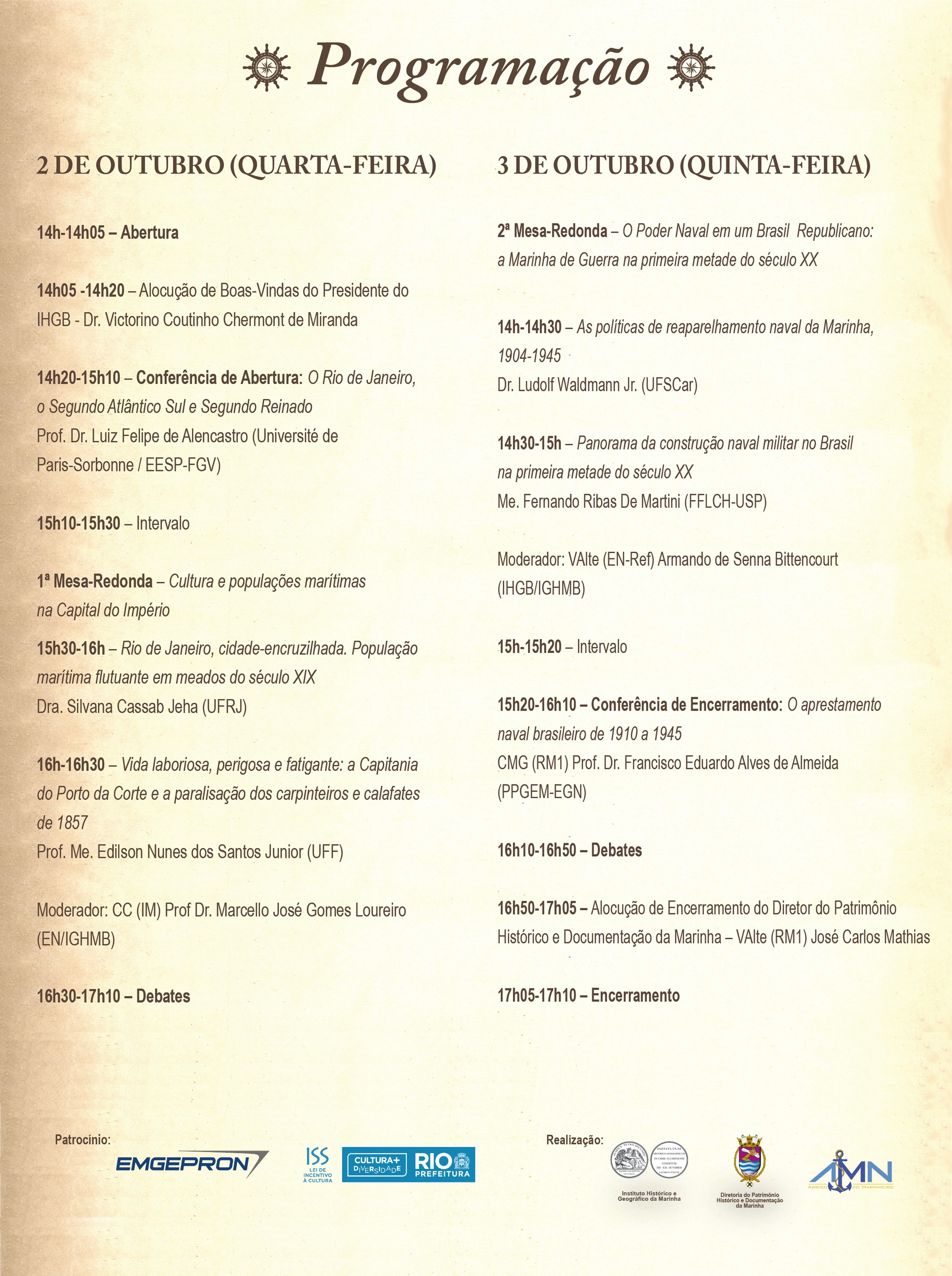 Promovendo uma participação ativa da sociedade na troca de saberes e debates sobre as questões que envolvem a história marítima e naval, o evento patrocinado pela Secretaria Municipal de Cultura, EMGEPRON e a Lei do ISS – Lei Municipal de Incentivo a Cultura destina-se a reunir profissionais de instituições acadêmicas, militares, representantes de fundações de pesquisa, estudantes e demais públicos interessados na abordagem.