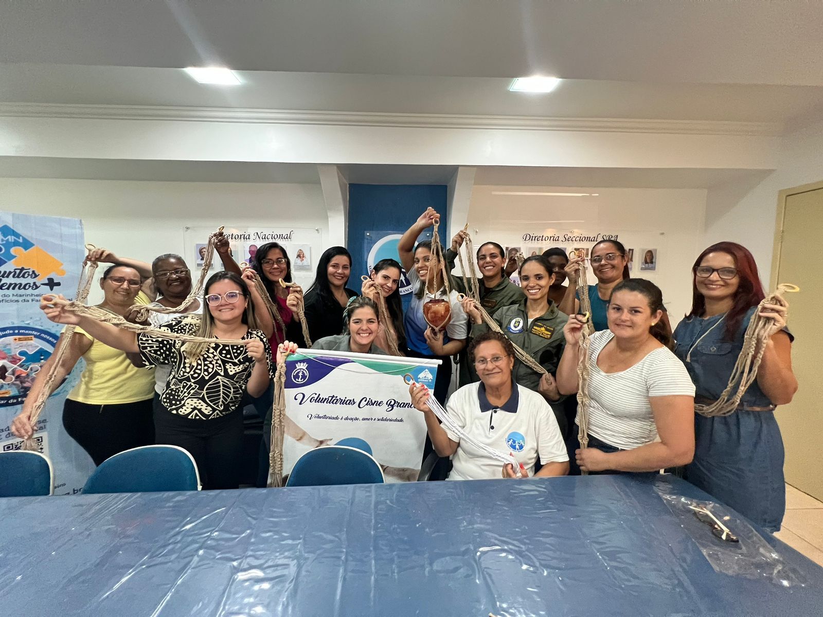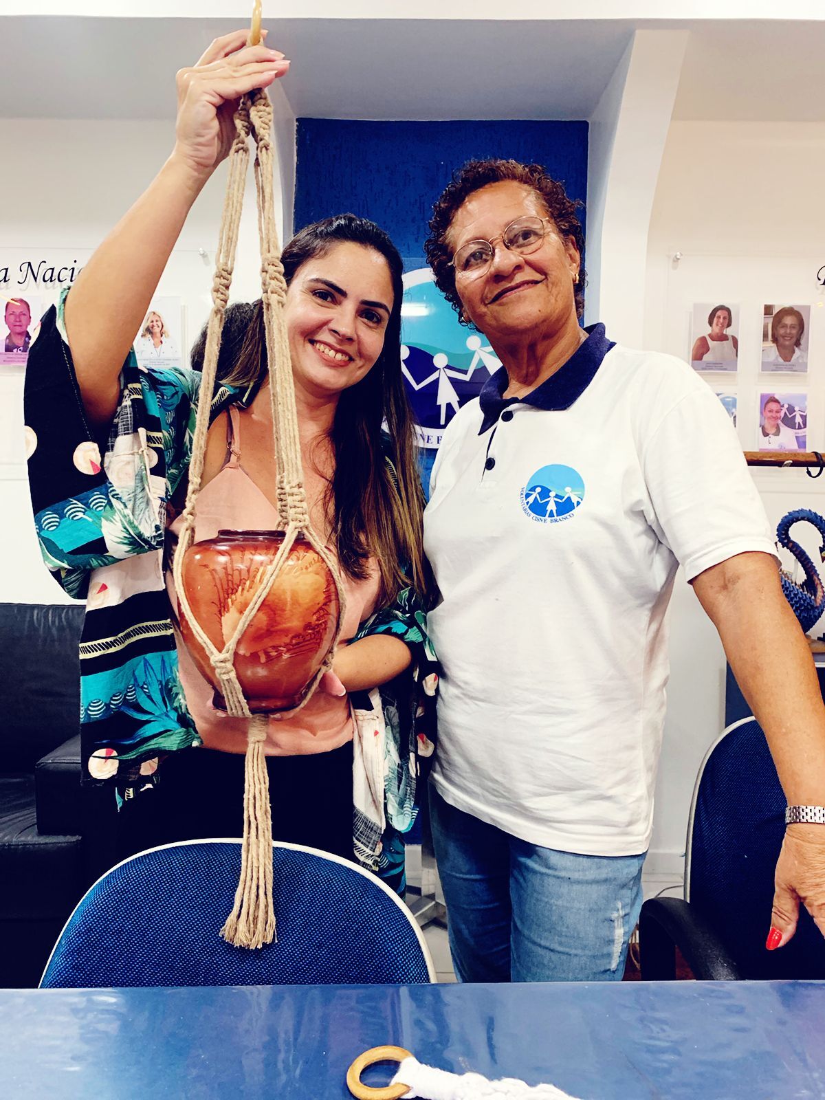 Na ocasião, a voluntária VCB Marilena conduziu a atividade com maestria, ensinando a fazer um lindo suporte suspenso de plantas e uma linda bolsa.