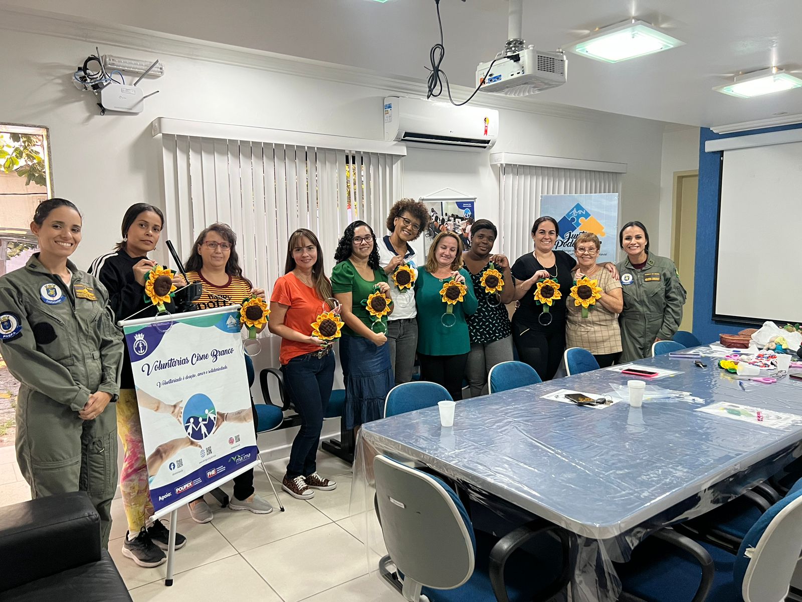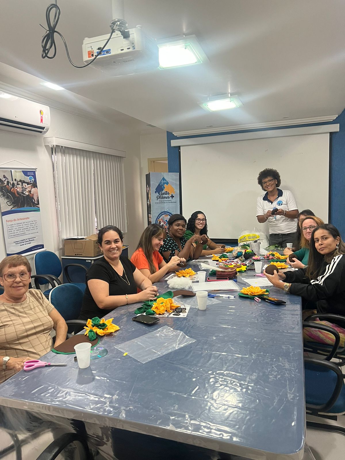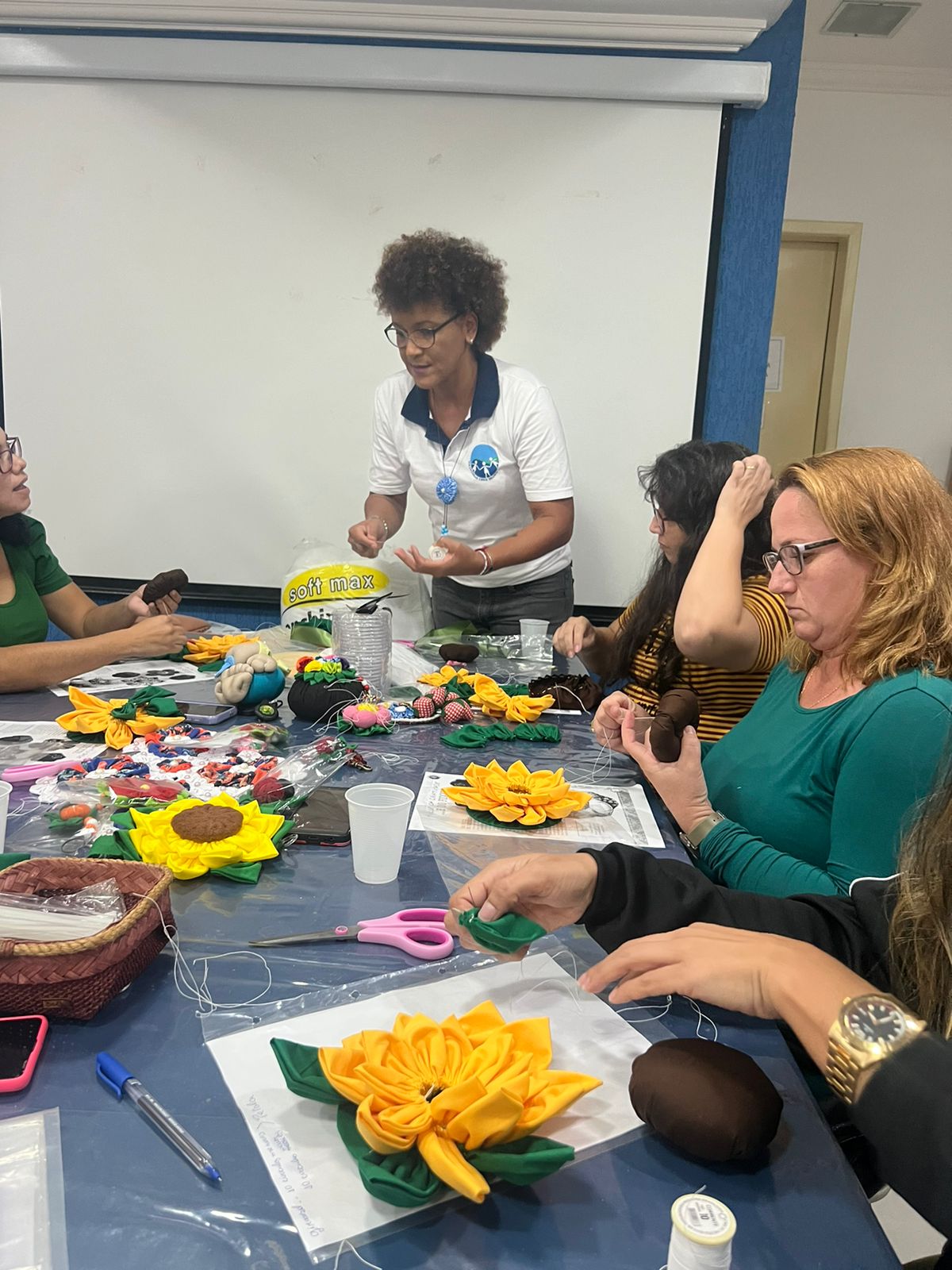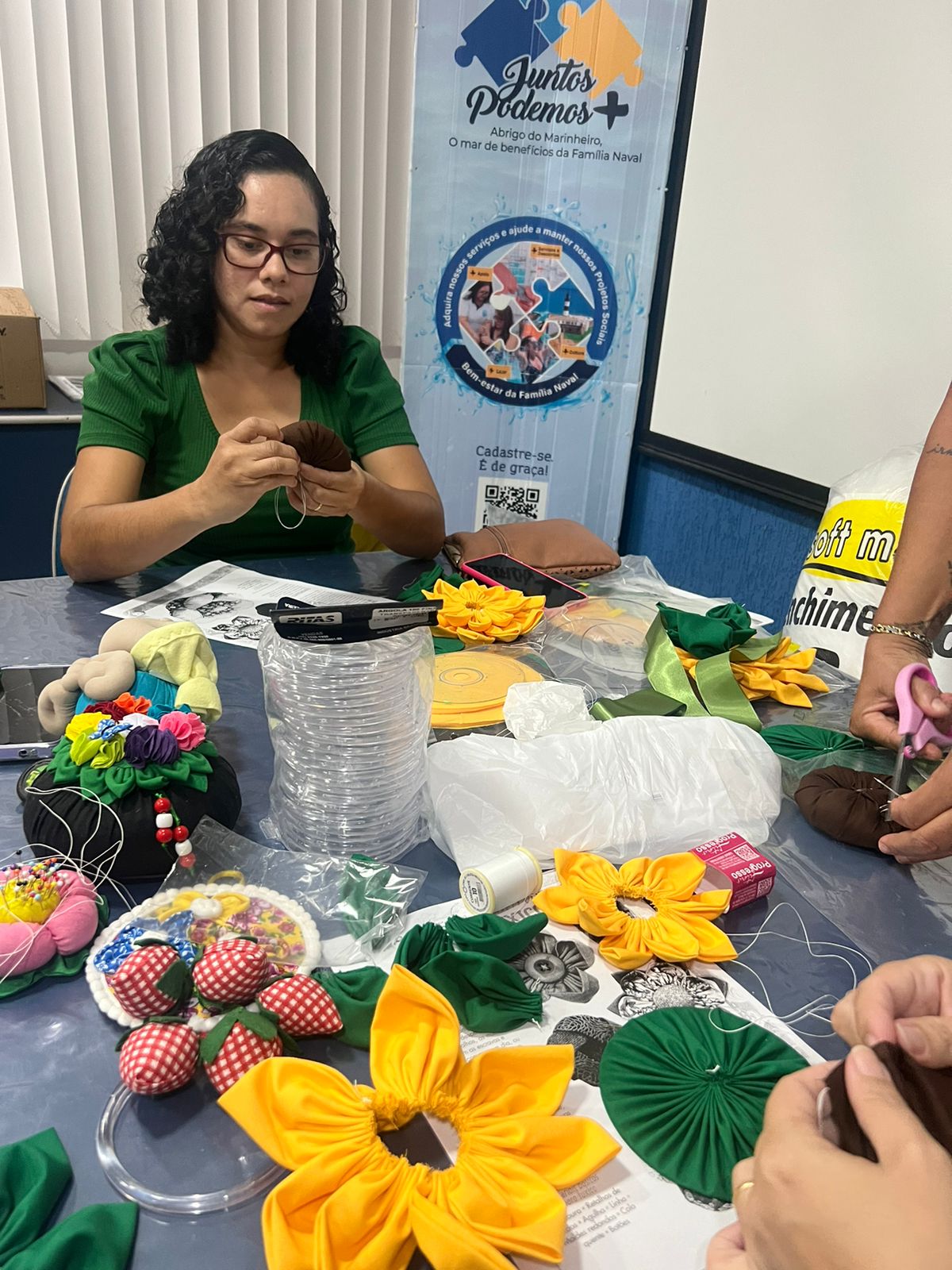 A aula foi conduzida pela voluntária VCB Márcia, que mostrou habilidade em ensinar a técnica do fuxico para as participantes.
