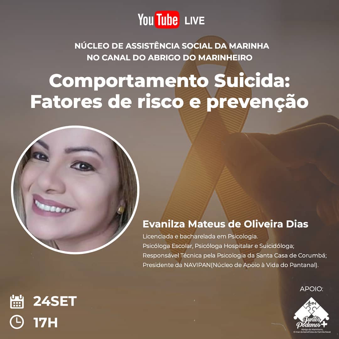 Em alusão as atividades voltadas para a campanha “Setembro Amarelo”, o Abrigo do Marinheiro em Ladário irá promover a live “Comportamento Suicida: Fatores de risco e prevenção”, onde serão abordadas estratégias de intervenção e prevenção ao suicídio.