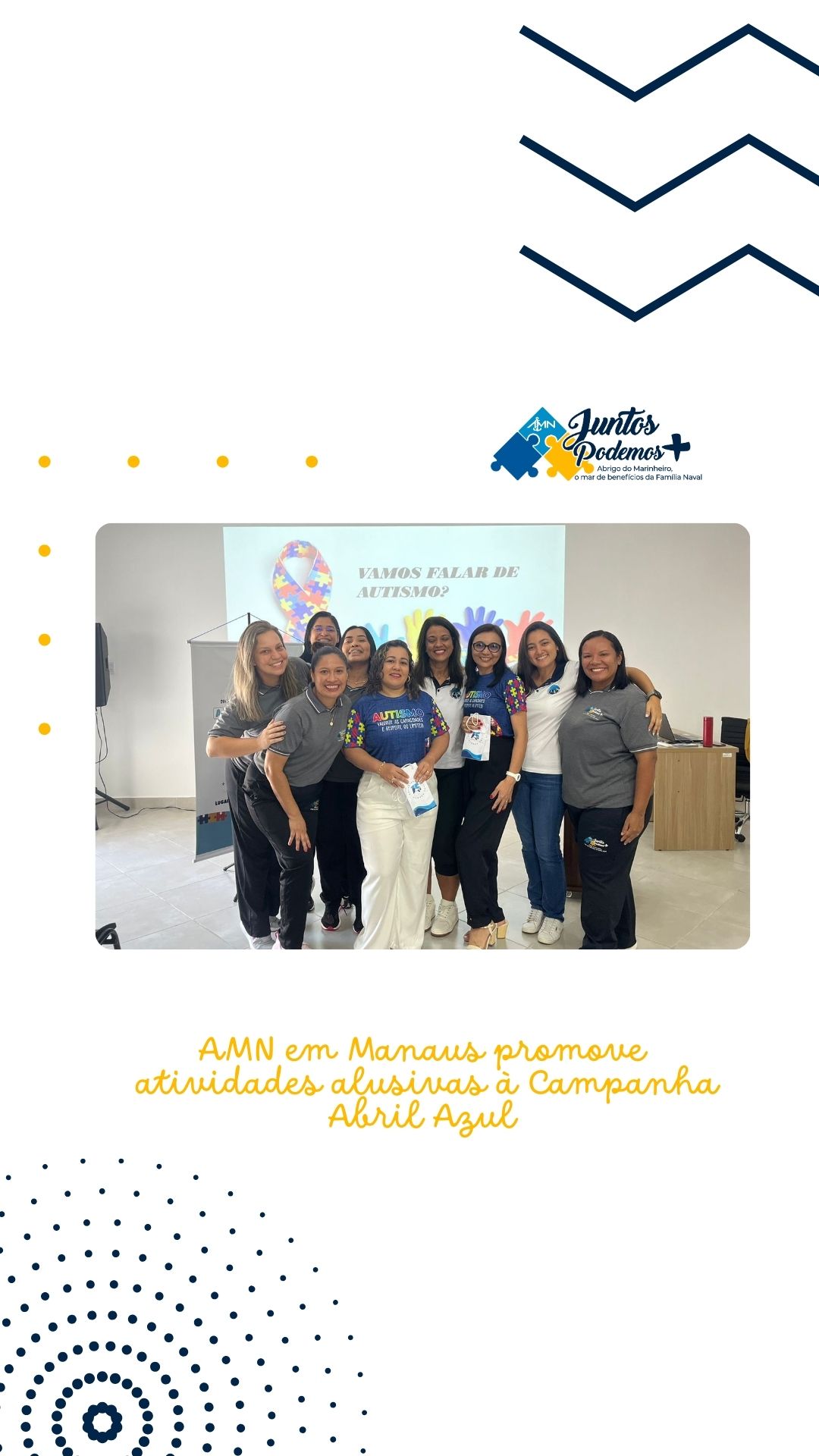 Em alusão ao Abril Azul, no dia 10 de abril o Abrigo do Marinheiro em Manaus, com apoio da VCB Seccional Manaus, promoveu uma palestra com a temática do mês de conscientização sobre o Transtorno do Espectro Autista (TEA), que foi conduzida pela Psicóloga Elizangela Maria Coimbra, e da Assistente social Raimara Uchoa, ambas da Associação de Amigos do Autista no Amazonas.
