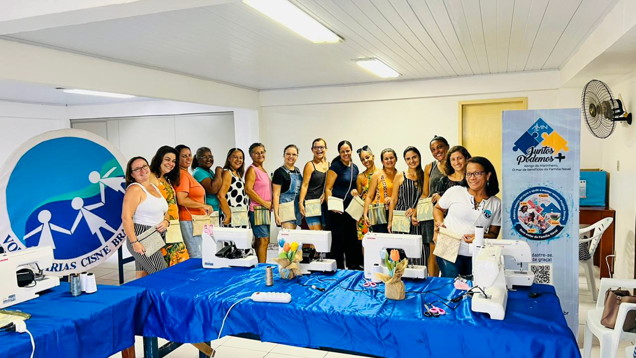 As participantes aprenderam a confeccionar uma linda bolsa e capas de almofadas, as quais poderão gerar renda extra para a Família Naval da região.