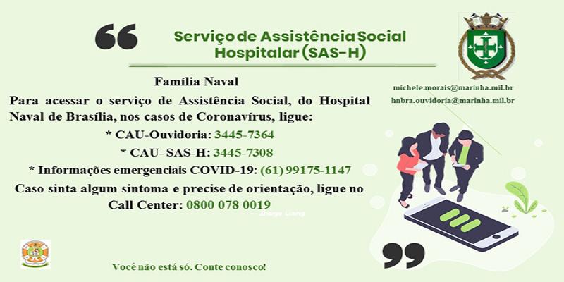 Visando prestar apoio efetivo à Família Naval em relação aos impactos decorrentes da pandemia do Novo Coronavírus (COVID-19) e da diretiva de isolamento domiciliar, o Hospital Naval de Brasília (HNBra) divulga os telefones úteis do Serviço de Assistência Social Hospitalar (SAS-H) para situações de necessidade. Além disso, o HNBra disponibiliza uma linha para informações emergenciais funcionando em regime de pronto atendimento.
