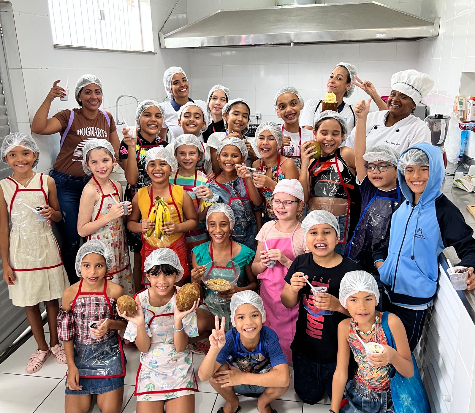 A oficina foi dividida em dois momentos. O primeiro foi dedicado a explicar sobre alimentação saudável, bem como apresentar os produtos que seriam usados na preparação da receita. Já o segundo, foi o momento de “colocar a mão na massa”. A receita escolhida para ensinar aos nossos mini-chefs foi o milk shake de açaí.