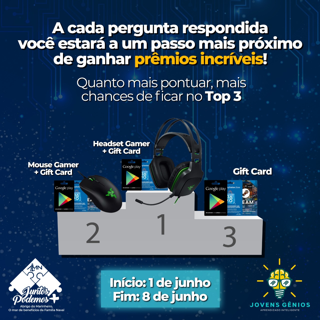 Se você é cadastrado na plataforma Jovens Gênios já deve ter percebido que existem modos de Batalhas para estudarem de uma forma mais divertida. A partir do dia 1º de Junho foi lançado um Desafio Multidisciplinar onde o participante tem a oportunidade de pontuar e subir no ranking com alunos do Brasil todo que são do mesmo ano escolar que você e que também participam do projeto. E o melhor, os 3 primeiros colocados de cada ano vão ganhar premiação.