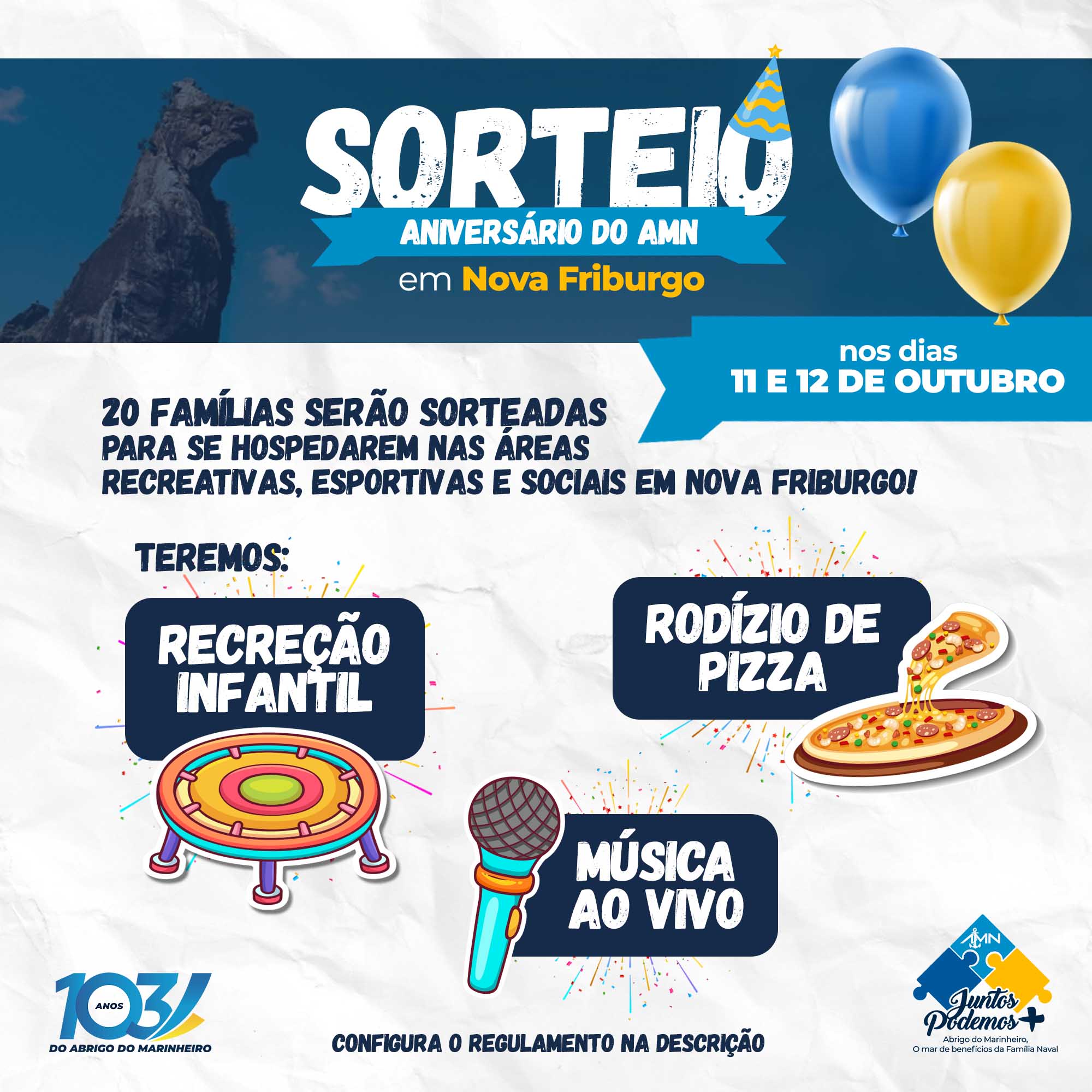 Para celebrar seus 103 anos de atividade, a Associação Abrigo do Marinheiro levará 20 famílias para se hospedarem nas Áreas Recreativas, Esportivas e Sociais de Nova Friburgo. A confraternização se dará nos dias 11 e 12 de outubro, e enquanto parte do grupo estará na Casa do Velho Marinheiro, outra estará no Timoneiro. Para distribuição das vagas, a associação empreenderá um sorteio para toda a Família Naval por meio do Instagram.