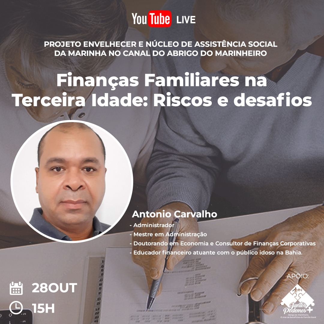 Na próxima quarta-feira, dia 28/10, às 15h, no canal do youtube da Associação Abrigo do Marinheiro será exibida a live sobre Finanças Familiares na Terceira Idade: Riscos e Desafios.