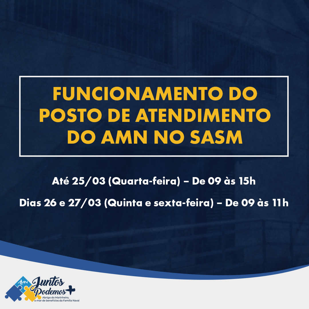 Devido à proliferação do novo Coronavirus (COVID-19) e com o objetivo de resguardar a Família Naval evitando aglomeração de pessoas, o Posto de Atendimento do Abrigo do Marinheiro(AMN)/Departamento de Serviços Sociais(DSS), localizado nas instalações do SASM funcionará conforme rotina a seguir: