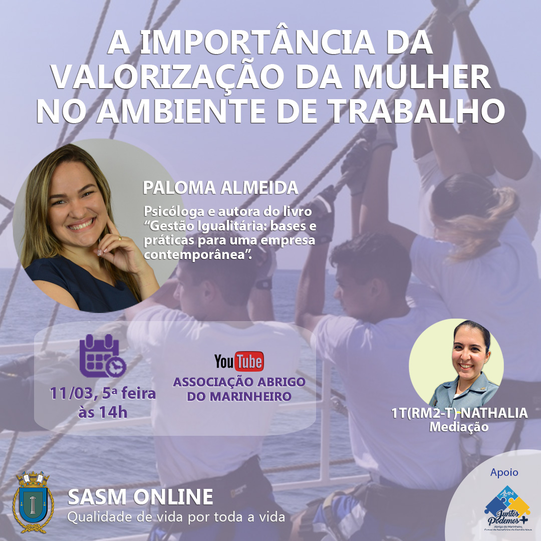 Com o apoio do Serviço de Assistência Social da Marinha, iremos promover uma live, junto com a psicóloga Paloma Almeida, abordando a temática “A importância da Valorização da Mulher no ambiente de trabalho”, onde a autora do livro “Gestão Igualitária: bases e práticas para uma empresa contemporânea” irá nos imergir em seus estudos e iniciativas para a igualdade de gênero no mundo empresarial e seus impactos sociais.