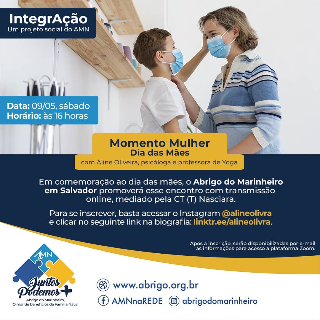 O AMN em Salvador convida as mamães da Família Naval para participar de um encontro online que será realizado no dia 9 de maio, às 16h, em alusão ao Dia das Mães. A atividade pertence ao projeto IntegrAção e será realizada pela psicóloga e professora de Yoga Aline Oliveira.