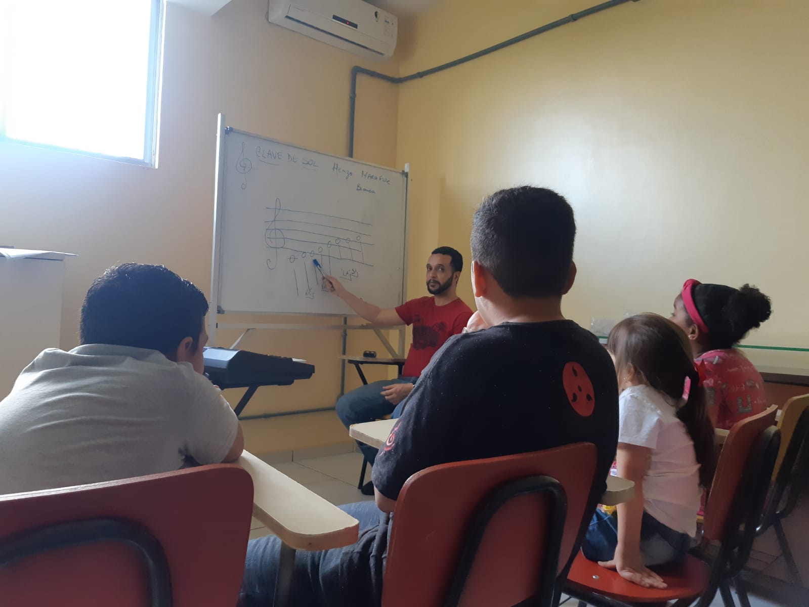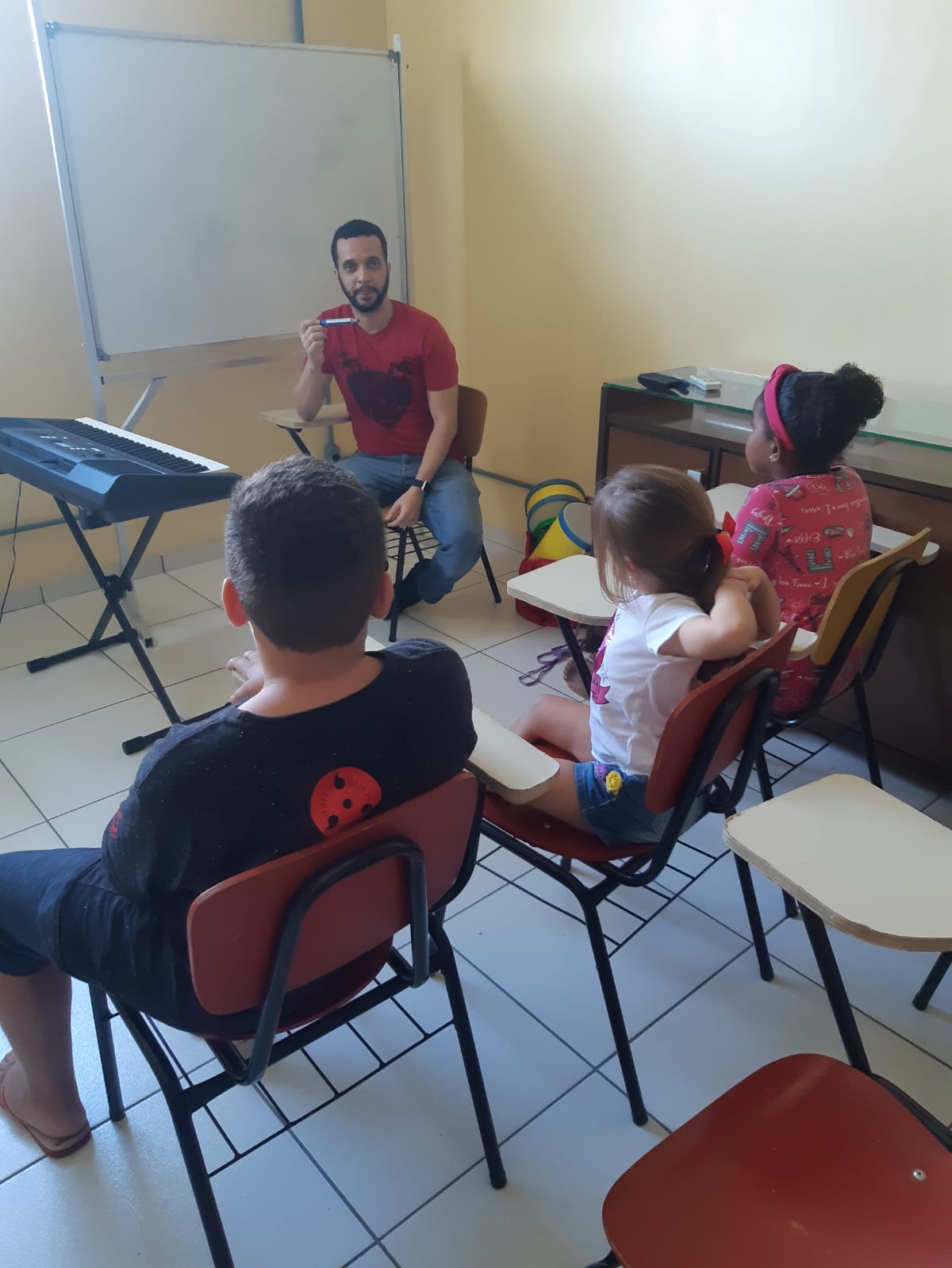 A atividade foi guiada pelo professor Jean, que apresentou aos pequenos, de forma lúdica e dinâmica, as notas musicais e os primeiros passos sobre alguns instrumentos.