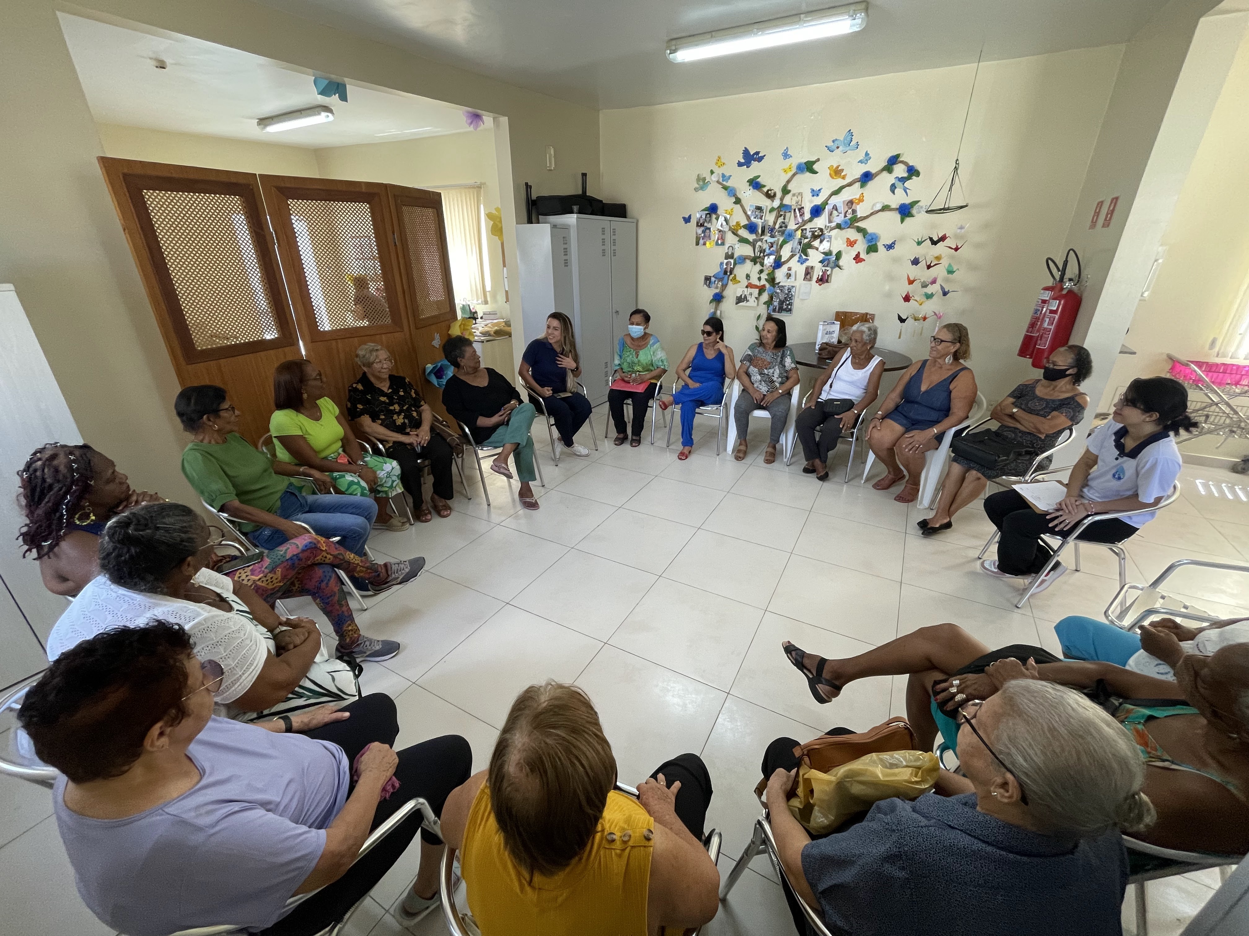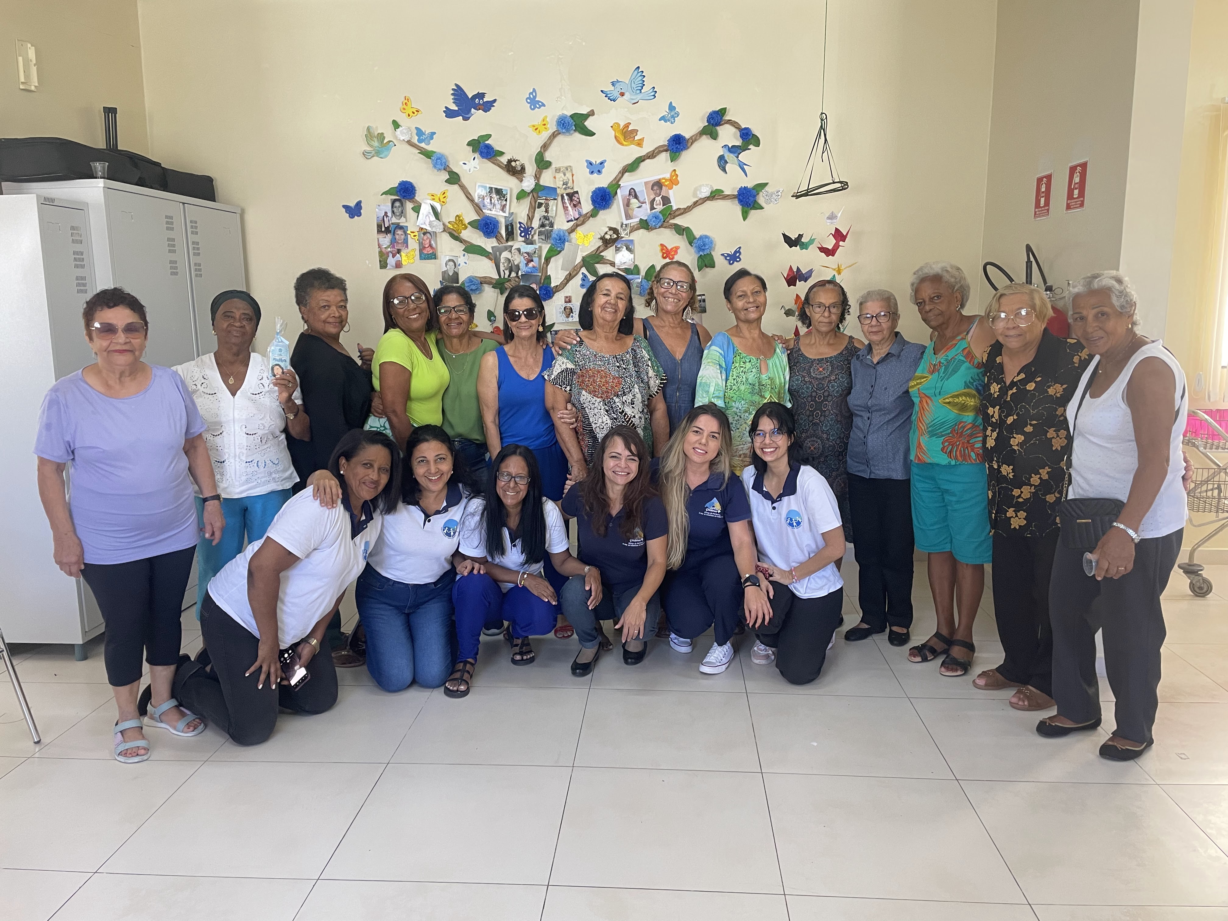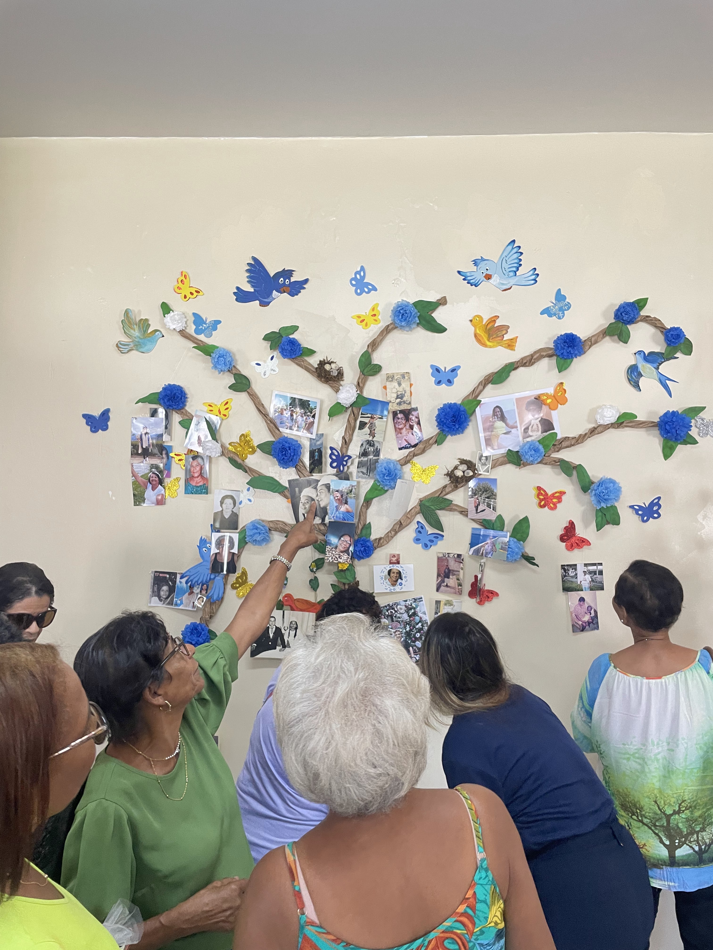 O encontro, que proporcionou um dia de acolhimento e muito afeto, contou com a presença das participantes do projeto Envelhecer na região, que se divertiram dançando zumba com a Instrutora Siloene, e ainda participaram do Grupo da Maturidade, conduzido pela voluntária VCB e psicóloga, Ana Letícia. No Grupo da Maturidade, foram abordadas temáticas sobre o envelhecimento com qualidade de vida e os papéis sociais ocupados pelas mulheres. Durante a roda de conversa, foi realizado um resgate da trajetória das mulheres do projeto Envelhecer, que falaram um pouco sobre os desafios, as conquistas e os enfrentamentos na trajetória de vida. Na oportunidade, foi construída uma árvore "Revivendo memórias", em que as participantes colocaram fotos de outras fases da vida e da fase atual, compartilhando experiências entre o grupo e gerando conexão social com todos presentes.