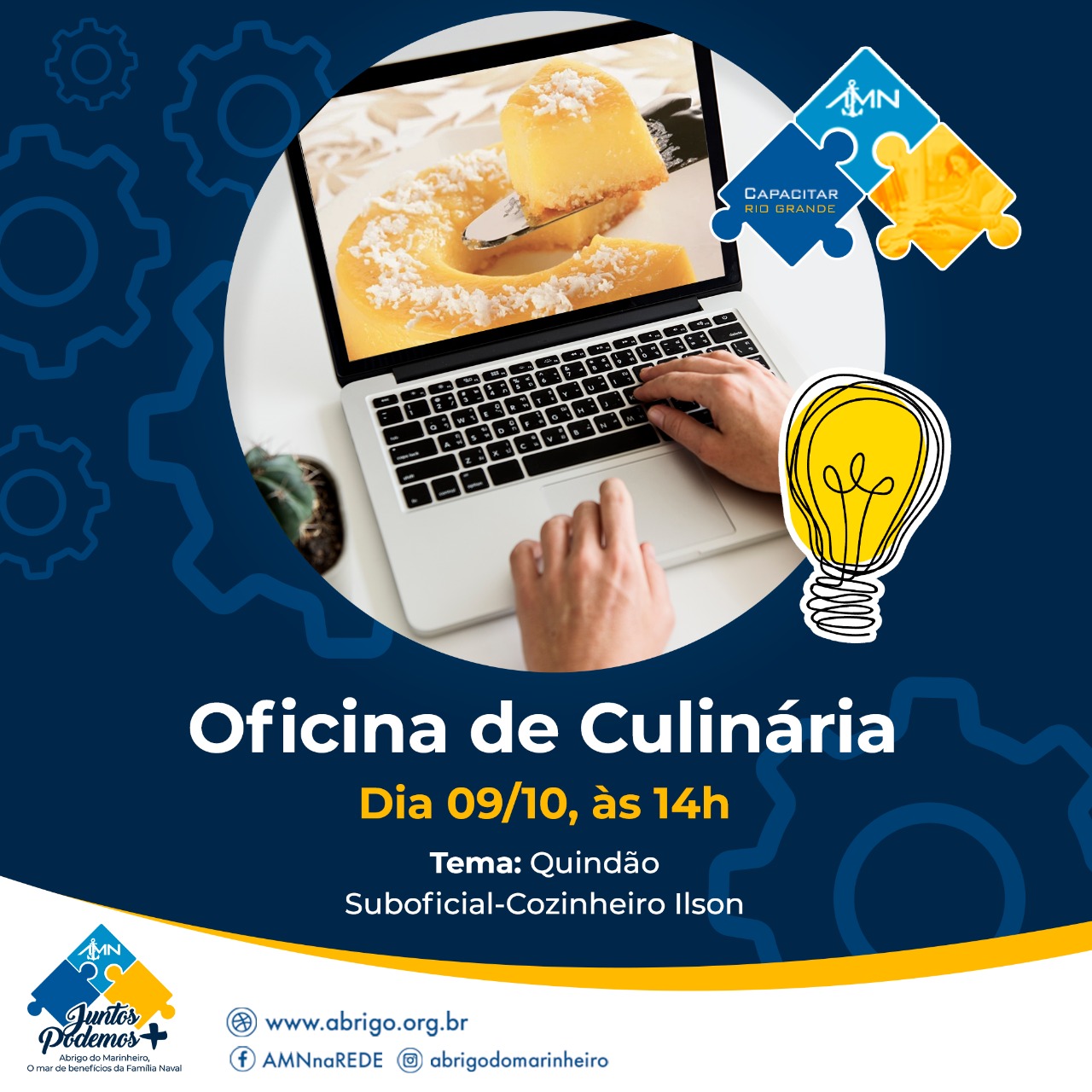 O AMN em Rio Grande vai trazer uma saborosa receita de quindão, uma sobremesa muito saborosa. A atividade será conduzida pelo Suboficial-Cozinheiro Ilson e estará disponível amanhã, dia 09/10, às 14h, em nosso canal do YouTube: https://youtu.be/HTLfKgqb630