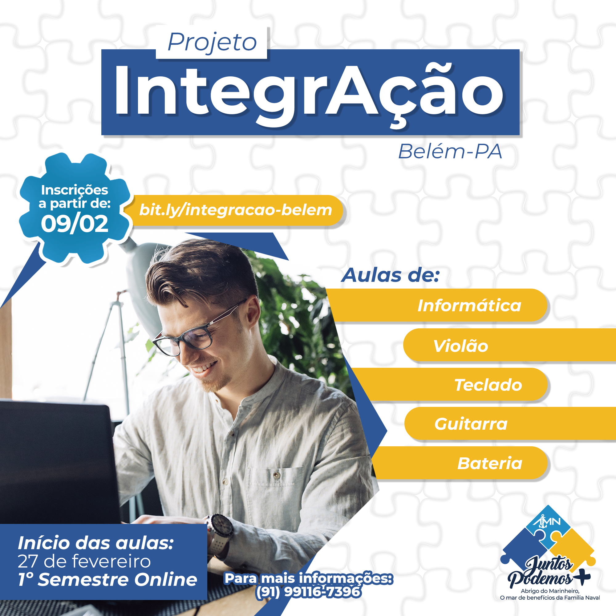 O AMN em Belém convida a Família Naval para as atividades do projeto IntegrAção, que contará com aulas de informática, violão, teclado, guitarra e bateria. No primeiro semestre de 2021 as atividades do projeto serão realizadas no ambiente virtual, a fim de diminuir os riscos de contaminação pela covid-19.