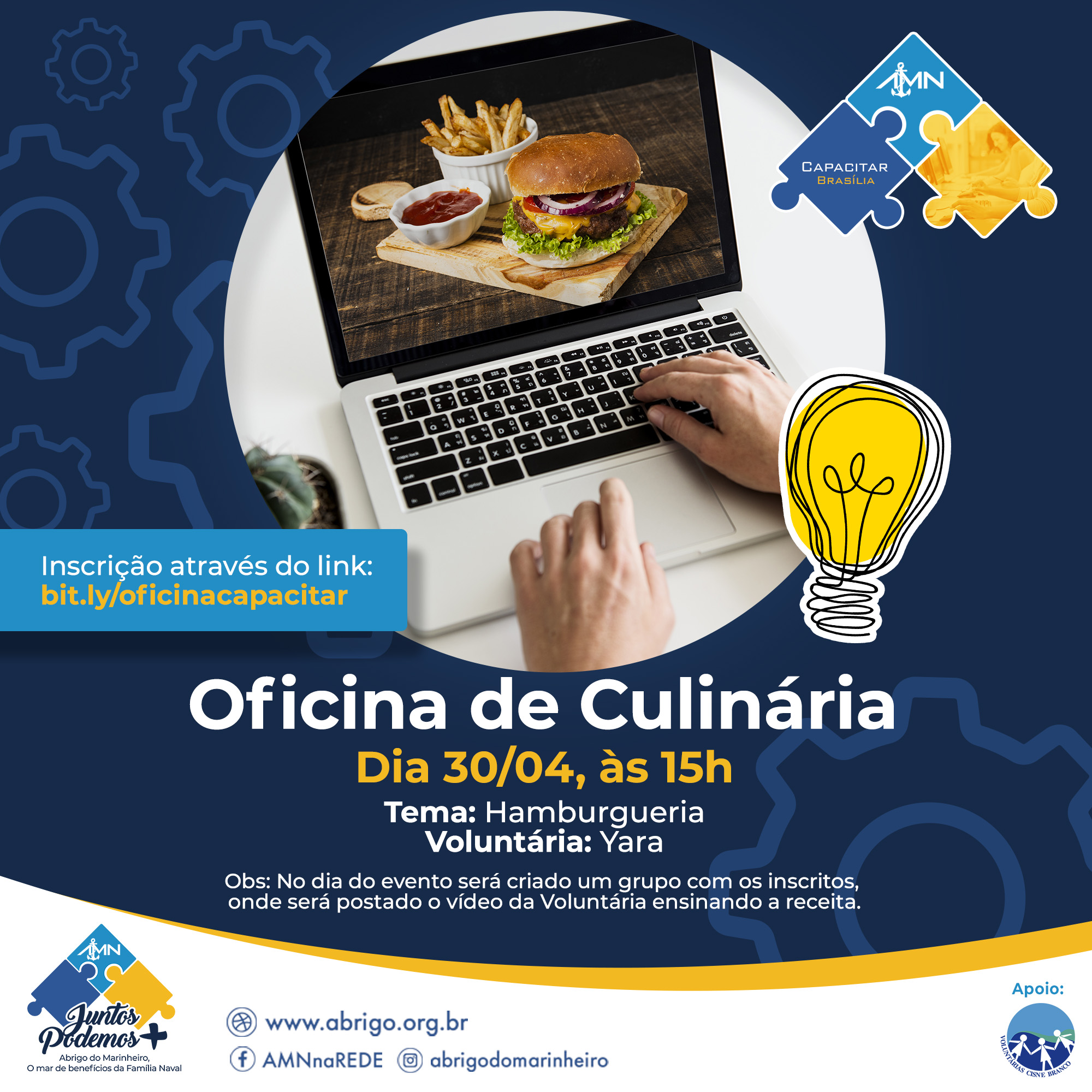 O Departamento Regional do Abrigo do Marinheiro em Brasília convida a Família Naval para participar da nossa primeira Oficina de culinária online (será compartilhado um video pelo whatsApp), no dia 30 de abril, às 15h. A Oficina de culinária será conduzida pela voluntária do Departamento VCB Yara, com tema “Hamburgueria.”