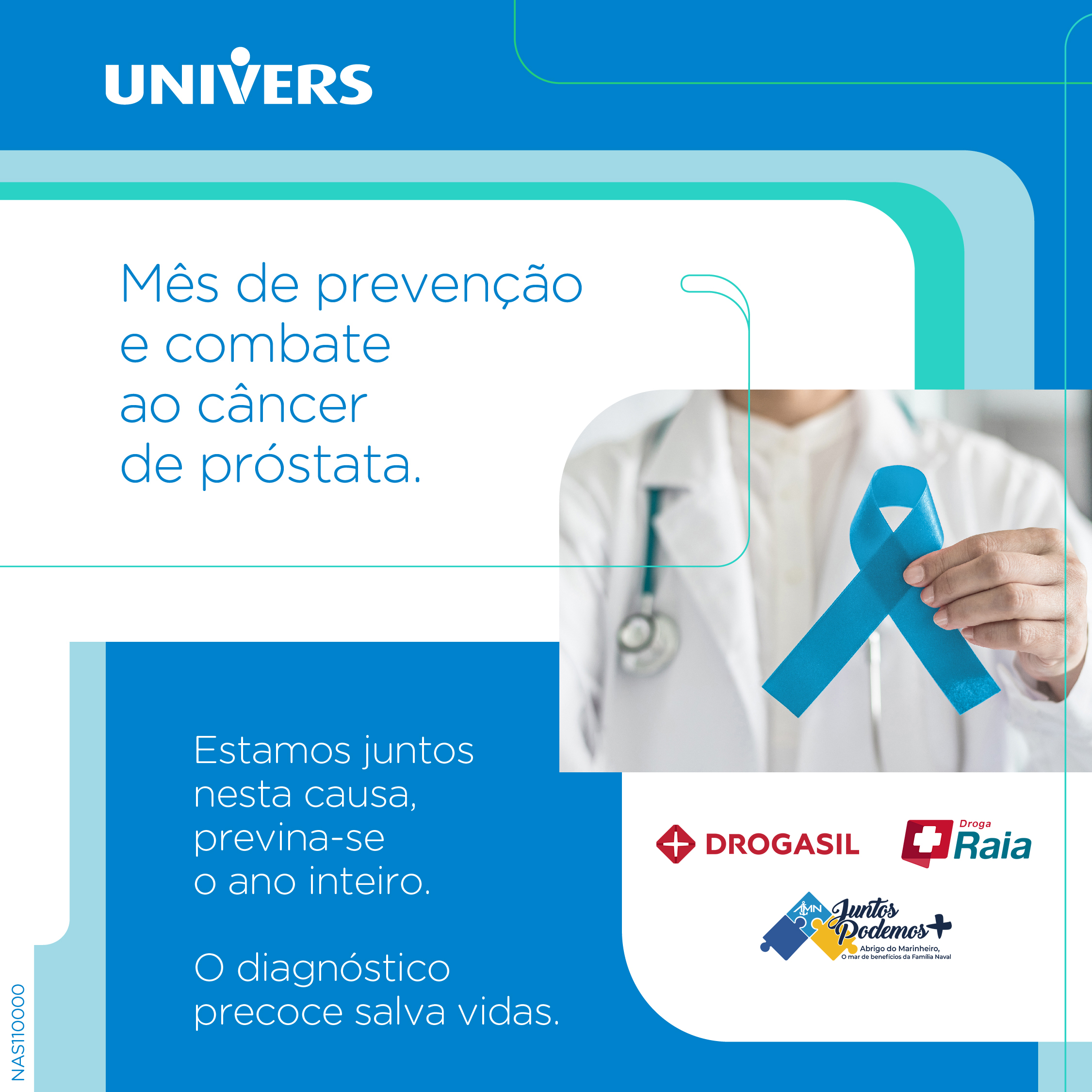 Em parceria com a Drograsil e Drogaraia, abraçamos a causa da campanha e temos como objetivo estimular aos nossos homens da Família Naval ao cuidado e manutenção de avaliações clínicas e exames de sangue preventivos, possibilitando imediatos tratamentos caso seja identificada alguma anormalidade na próstata.
