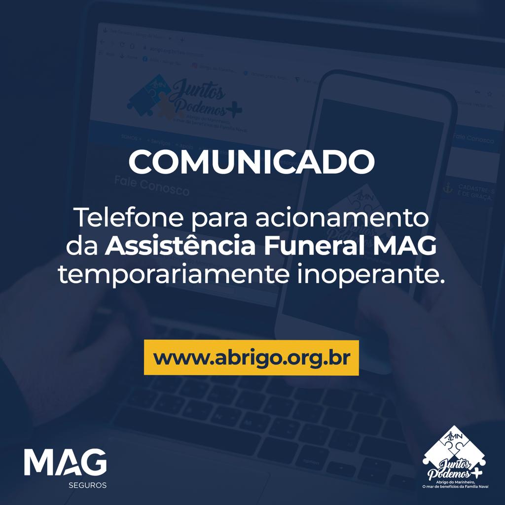 Em virtude de problemas técnicos, o telefone para acionamento da prestação dos serviços de Assistência Funeral encontra-se temporariamente inoperante. Em caso de necessidade, a MAG Seguros disponibilizará, em caráter provisório, o telefone 0800-026-0909, até que a situação se normalize.