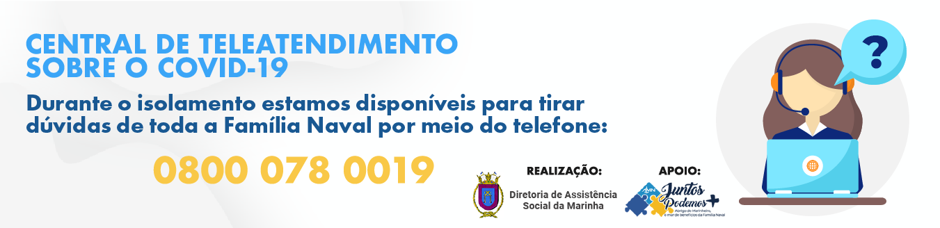 Buscando apoiar a Família Naval a cerca das prevenções e dúvidas sobre o Coronavírus (COVID-19), uma Central de Teleatendimento foi colocada à disposição 24h. O acesso se dá pelo telefone: 0800 078 0019, de forma gratuita para todo Brasil.