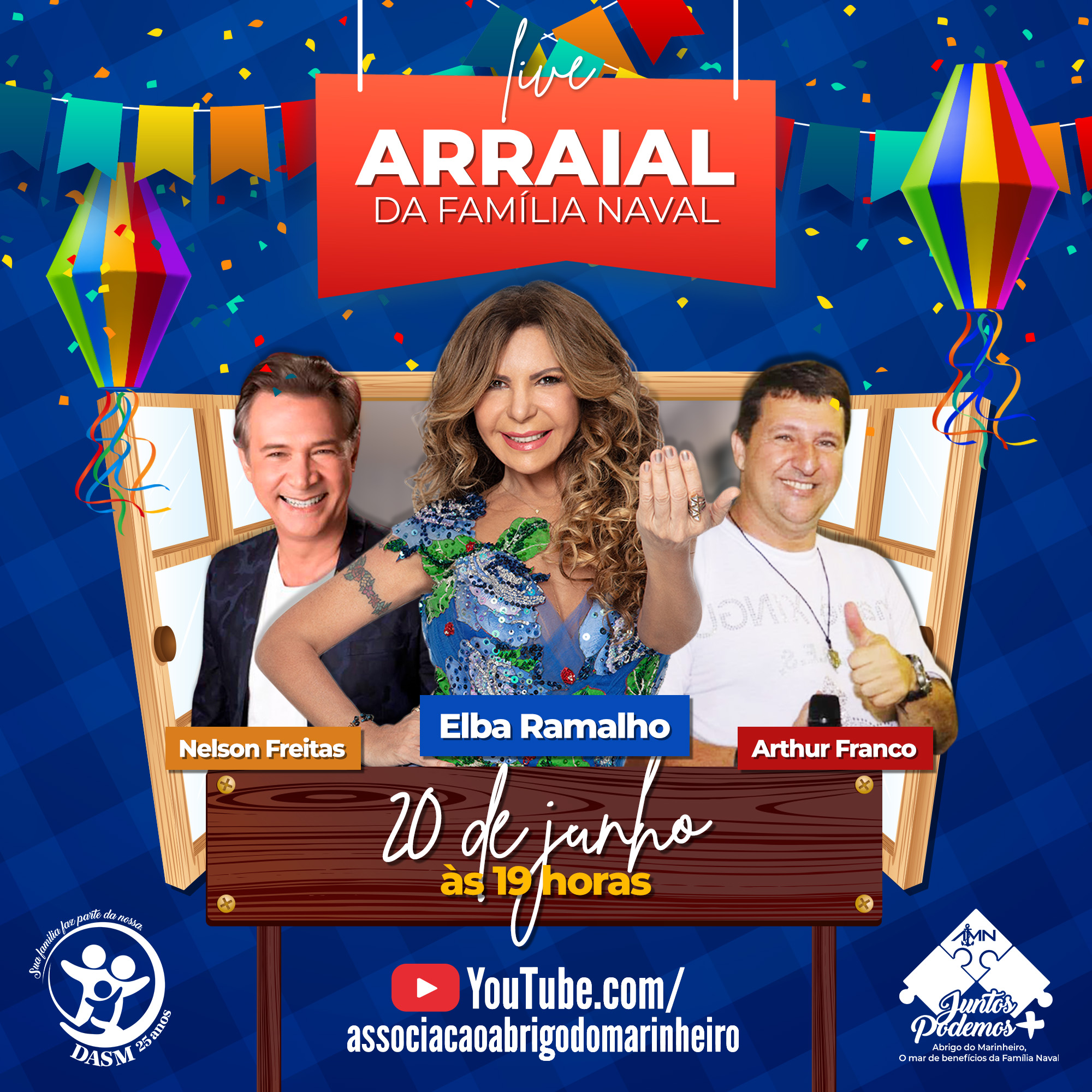 Não perca o “Arraial da Família Naval” transmitido pelo canal oficial do Abrigo do Marinheiro no YouTube. Com direito a quadrilha e muita brincadeira de São João, o evento terá apresentação musical da Elba Ramalho, um momento especial com o ator humorista Nelson Freitas, e a condução do quadrilheiro Arthur Franco.