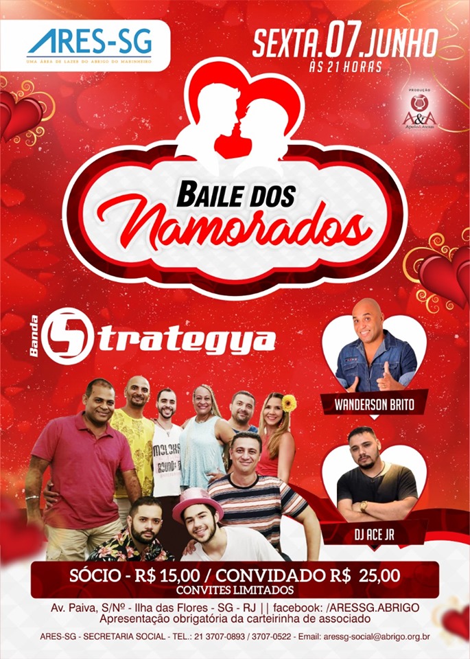 A ARES-SG convida os namorados, e também os solteiros, para o Baile temático em alusão ao Dia dos Namorados. O evento será realizado no dia 7 de junho, a partir das 21h, no salão social, e vai contar com uma decoração temática, sorteios, shows e gastronomia diferenciada, agregando requinte e romantismo para a noite dos apaixonados.