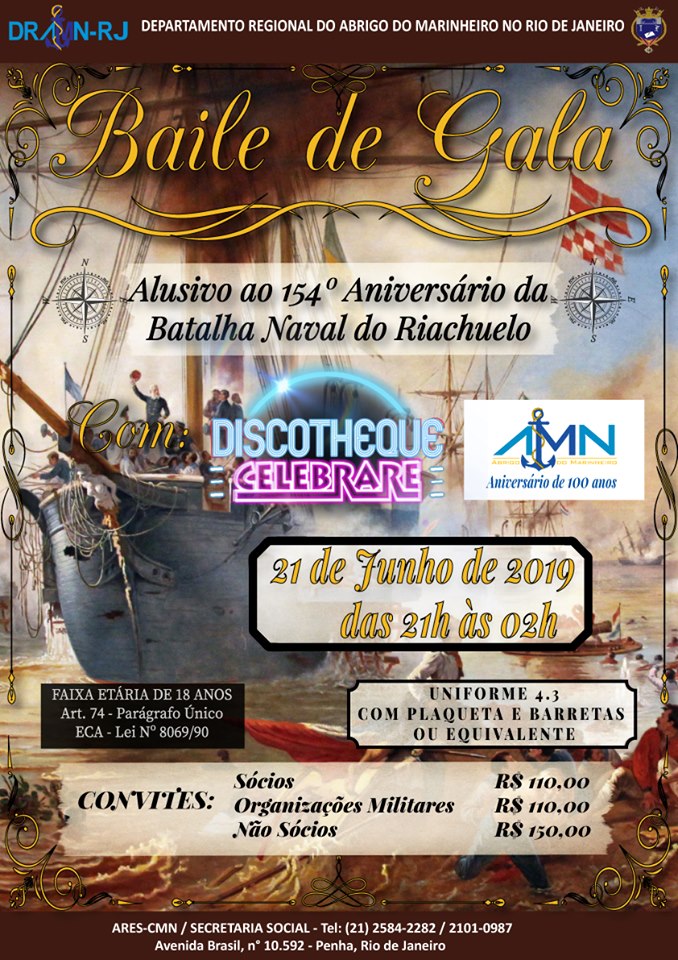 A ARES Casa do Marinheiro convida a Família Naval para o tradicional Baile de Gala alusivo à 154ª Batalha Naval do Riachuelo, que será realizado no dia 21 de junho, entre 21h e 02h. Convide seus amigos e familiares para compartilhar uma noite maravilhosa de diversão e música boa. E este ano, ao ritmo da famosa banda Celebrare.