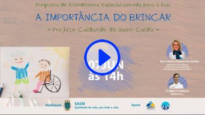 O SASM apresenta hoje uma Live do Projeto Cuidando de Quem Cuida, onde abordará tema de relevância para os usuários do Programa de Atendimento Especial - PAE: “A importância do Brincar”.