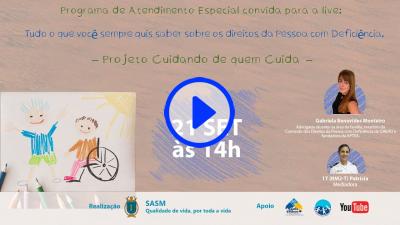 O SASM apresenta hoje uma Live do Projeto Cuidando de Quem Cuida, onde abordará tema de relevância para os usuários do Programa de Atendimento Especial - PAE: Tudo o que você sempre quis saber sobre os direitos da Pessoa com Deficiência